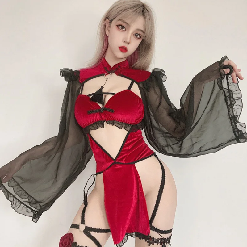 High-concerned chemical: None Model Number: Sexy Lingerie Uniform Halloween Costumes for Women Theme: Demon Material: POLYESTER Origin: Mainland China CN: Guangdong Special Use: costumes Color: Red Black Size: One Size Fabric name: Spandex Details: perspective Package includes:Top+Dress+Leg Ring*2 Size: One Size,Neck circumference:40cm Shoulder width: 38cm Lower Chest: 65-102cm Dress Length:74cm Waist: 68-88cm Recommended Weight:40-60kg.