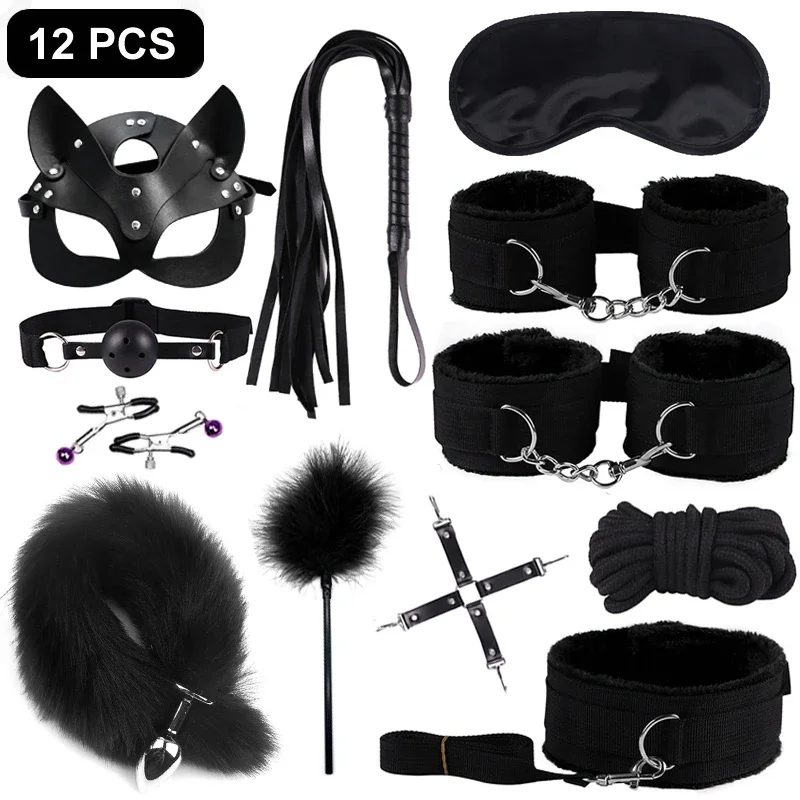 Sexy Leather BDSM Kits Handcuffs Nipple Clamps Whip Spanking Plush Sex Bondage Set Handcuffs Sex Games Sex Toys for Women Men